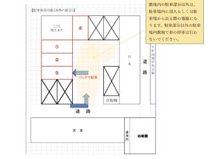 送迎時に利用されている千年団地中央公園並びの駐車場ですが、添付画像の通り、本園関係者の駐車が可能な場所は下の図の赤色で示した場所のみです。その他の場所に関しましては、園との契約ではありません。ほかの契約者様のご迷惑になりますので駐車されないようお願いいたします。